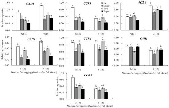 After bagging for seven to nine weeks, the relative expression of the C4H1 gene in the peels of two-layer bagged fruits increased while those in the peels from other groups decreased. Thus, no specific trend was noted for the different bagged groups.