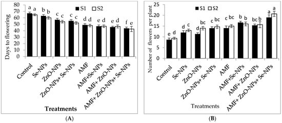 Effect of inoculation with Arbuscular mycorrhiza fungus (AMF), foliar applications of ZnO-NPs, foliar applications of Se-NPs, ZnO-NPs + Se-NPs, AMF + ZnO-NPs, AMF + Se-NPs, AMF + ZnO-NPs + Se-NPs, and untreated plants (control) on (A) days to flowering, and (B) number of flowers of chili plants during (S1: 2021 and S2: 2022) seasons. Vertical bars indicate the standard error of the mean. The LSD test demonstrates that differences among values in each bar that are marked by different letters (a–f) are significant at p ≤ 0.05.