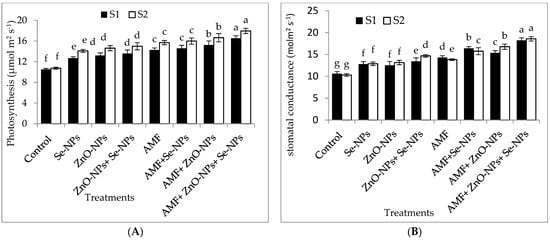 The highest values of chlorophyll content, photosynthesis, transpiration rate, and stomatal conductance were recorded for AMF combined with nanoparticles mixture (ZnO-NPs + Se-NPs) in both seasons (Figure 2A–D). The observed impact of AMF on physiological features may be attributable to its contribution to decreasing N2O emissions by increasing N uptake, therefore improving photosynthesis and potassium uptake [34]. Zn is required for the activities of enzymes [23,24]. These findings are consistent with those reported by the authors of [34]. Generally, metallic nanoparticles have active effects on photosynthetic efficiency, which increases light absorption by chlorophyll [36].