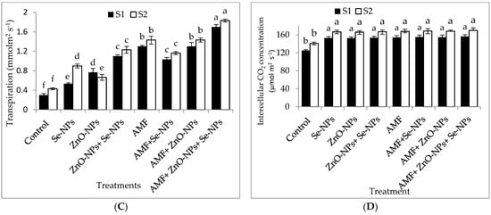Effect of inoculation with Arbuscular mycorrhiza fungus (AMF), foliar applications of ZnO-NPs, foliar applications of Se-NPs, ZnO-NPs + Se-NPs, AMF + ZnO-NPs, AMF + Se-NPs, AMF + ZnO-NPs + Se-NPs, and untreated plants (control) on (A) photosynthesis rate, (B) stomatal conductance, (C) transpiration rate, and (D) intercellular CO2 concentration of chili plants during (S1: 2021 and S2: 2022) seasons. Vertical bars indicate the standard error of the mean. The LSD test demonstrates that differences among values in each bar that are marked by different letters (a–f) are significant at p ≤ 0.05.
