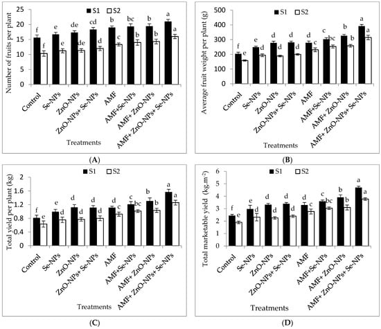 Effect of inoculation with Arbuscular mycorrhiza fungus (AMF), foliar applications of ZnO-NPs, foliar applications of Se-NPs, ZnO-NPs + Se-NPs, AMF + ZnO-NPs, AMF + Se-NPs, AMF + ZnO-NPs + Se-NPs, and untreated plants (control) on (A) number of fruits per plant, (B) average fruit weight per plant, (C) total yield per plant, and (D) total marketable yield per (m2) of chili plants during (S1: 2021 and S2: 2022) seasons. Vertical bars indicate the standard error of the mean. The LSD test demonstrates that differences among values in each bar that are marked by different letters (a–f) are significant at p ≤ 0.05.