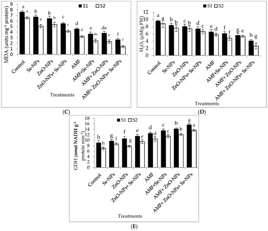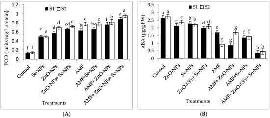 Effect of inoculation with Arbuscular mycorrhiza fungus (AMF), foliar application of ZnO-NPs, foliar application of Se-NPs, ZnO-NPs + Se-NPs, AMF + ZnO-NPs, AMF + Se-NPs, AMF + ZnO-NPs + Se-NPs, and untreated plants (control) on (A) peroxidase (POD), (B) abscisic acid (ABA), (C) malondialdehyde (MDA), (D) hydrogen peroxide (H2O2), and (E) glutamate dehydrogenase (GDH) of chili leaves during (S1: 2021 and S2: 2022) seasons. Vertical bars indicate the standard error of the mean. The LSD test demonstrates that differences among values in each bar that are marked by different letters (a–h) are significant at p ≤ 0.05.