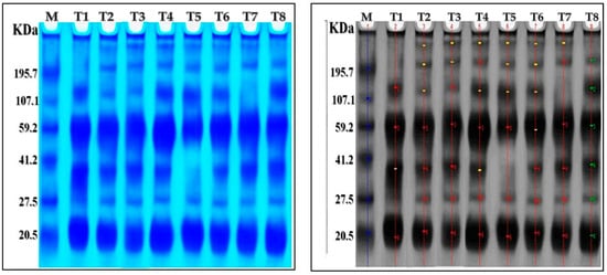The effect of AMF inoculation, nanoparticle foliar application, and their combined interactions on protein banding patterns of SDS-PAGE of pepper plants subjected to cold stress. T1: control, T2: Se-NPs, T3: ZnO-NPs, T4: AMF + ZnO-NPs + Se-NPs, T5: AMF + Se-NPs, T6: AMF + ZnO-NPs, T7: AMF, T8: ZnO-NPs + Se-NPs.