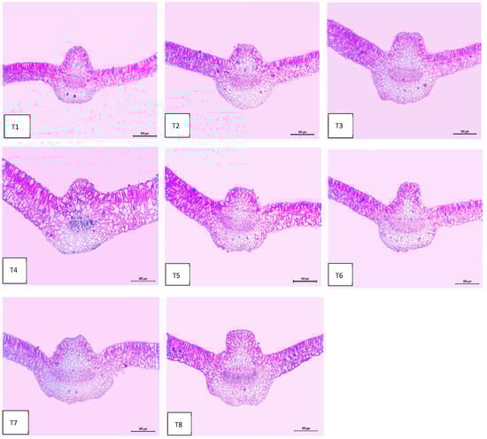 Microphotographs of cross sections through the chili pepper leaf, treated with Arbuscular mycorrhiza fungus (AMF) and foliar application of nanoparticles after 45 days from transplanting. Scale bars = 500 µm. (T1) control (untreated plants); (T2) Se-NPs; (T3) ZnO-NPs; (T4) ZnO-NPs + Se-NPs; (T5) AMF inoculation; (T6) AMF + Se-NPs; (T7) AMF + ZnO-NPs and (T8) AMF + (ZnO-NPs + Se-NPs).