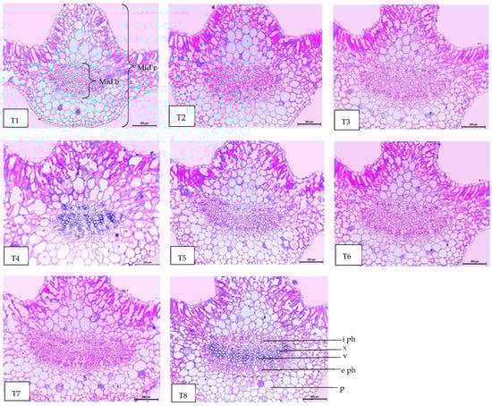 Magnified portions of the leaf midvein bundle of chili pepper plants after 45 days from transplanting. Scale bars = 200 µm. (T1) control (untreated plants); (T2) Se-NPs; (T3) ZnO-NPs; (T4) ZnO-NPs + Se-NPs; (T5) AMF inoculation; (T6) AMF + Se-NPs; (T7) AMF + ZnO-NPs and (T8) AMF + (ZnO-NPs + Se-NPs). Details: mid b, midvein bundle; mid r, midvein region; e ph, external phloem; i ph, internal phloem; v, vessel; x, xylem and p, parenchyma.