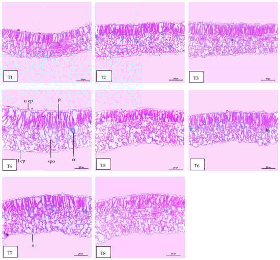 Magnified portions of the leaf blade lamina of chili pepper plants after 45 days from transplanting. Scale bars = 200 µm. (T1) control (untreated plants); (T2) Se-NPs; (T3) ZnO-NPs; (T4) ZnO-NPs + Se-NPs; (T5) AMF inoculation; (T6) AMF + Se-NPs; (T7) AMF + ZnO-NPs and (T8) AMF + (ZnO-NPs + Se-NPs). Details: l ep, lower epidermis; u ep, upper epidermis; cr, cells with dark content containing calcium oxalate crystals; s, stomata; spo, spongy tissue, and p, palisade tissue.
