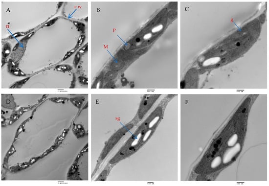 The effect of AMF + (ZnO-NPs + Se-NPs) on mesophyll parenchyma and chloroplast ultrastructure in pepper leaves: (A–C) Control plants, (D–F) Plants treated with AMF + (ZnO-NPs + Se-NPs). Details: cw, cell wall; n, nucleus; sg, starch granule; p, plastoglobule; m, mitochondria and g, grana. (A,D) scale bars = 2 m; (B,E) scale bars 500 nm; (C,F): scale bars = 500 nm.