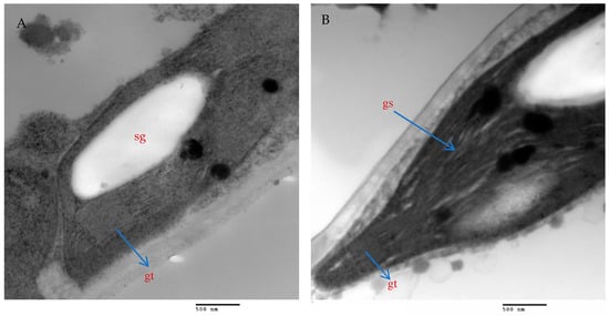Magnified portions of the chloroplast ultrastructure in chili leaves. Scale bars = 500 nm. (A)—Control plants; (B)—Plants treated with AMF + (ZnO-NPs + Se-NPs). Details: sg, starch granule; gt, stacked grana thylakoids; gs, non-stacked stroma thylakoids.