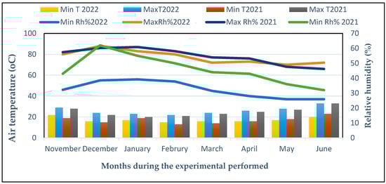 Climatic data for every month during the 2021 and 2022 seasons in The Experimental Field at Cairo University in Giza, Egypt. Minimum relative humidity (Min Rh%), minimum air temperature (Min T (°C)), and maximum air temperature (Max T, (°C)), maximum relative humidity (Max Rh%).