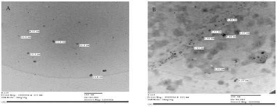 Zinc oxide nanoparticles (ZnO-NPs) were formed from zinc chloride (General Purpose Reagent, minimum 98.5%, Sigma-Aldrich, Munich, Germany). Zink oxide nanoparticles (ZnO-NPs) (Figure 12A) were prepared using the method described in [58]. Zinc Oxide nanoparticles were synthesized from an aqueous solution containing zinc chloride. NaOH was gradually introduced at a molar ratio of 1:2 over 8 h. The obtained precipitate was thoroughly filtered and washed with ionized water in a mixture of water and toluene using a high-speed stirrer, followed by additional washing with only ionized water for 3 h. The precipitate was dried in an oven at 100 °C. Selenium nanoparticles (Se-NPs) (Figure 12B) were formed according to a previously described protocol [59]. Se-NPs were created by the chemical reduction of sodium selenite by glutathione. In particular, 9 mL of double-distilled water in a sterile cabinet was mixed with 3 mL of 25 mM Na2SeO3. A total of 1 M NaOH was added to the reactant solution after mixing to increase the pH to that of the alkaline media. Se-NPs were generated as soon as NaOH was added, as shown by the color change in the reactant solution from clear white to clear red. The structure and sizes of (ZnO-NPs) and (Se-NPs) were studied using a transmission electron microscope Jeol (JEM—1400 TEM). In addition, TEM imaging was performed in the TEM laboratory at the Research Park (CURP), Faculty of Agriculture, Cairo University, Cairo, Egypt.
