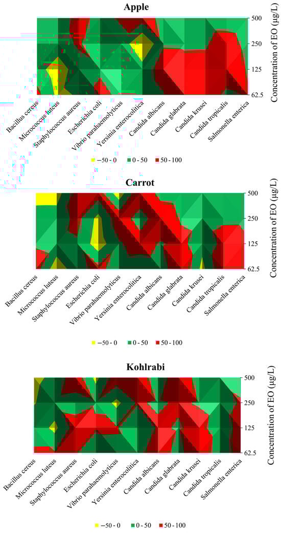Graphic elaboration of in situ antimicrobial activity (%) in apple, carrot, and kohlrabi.
