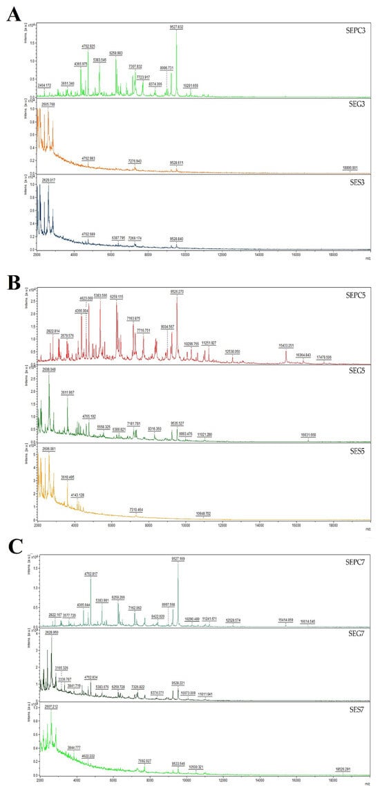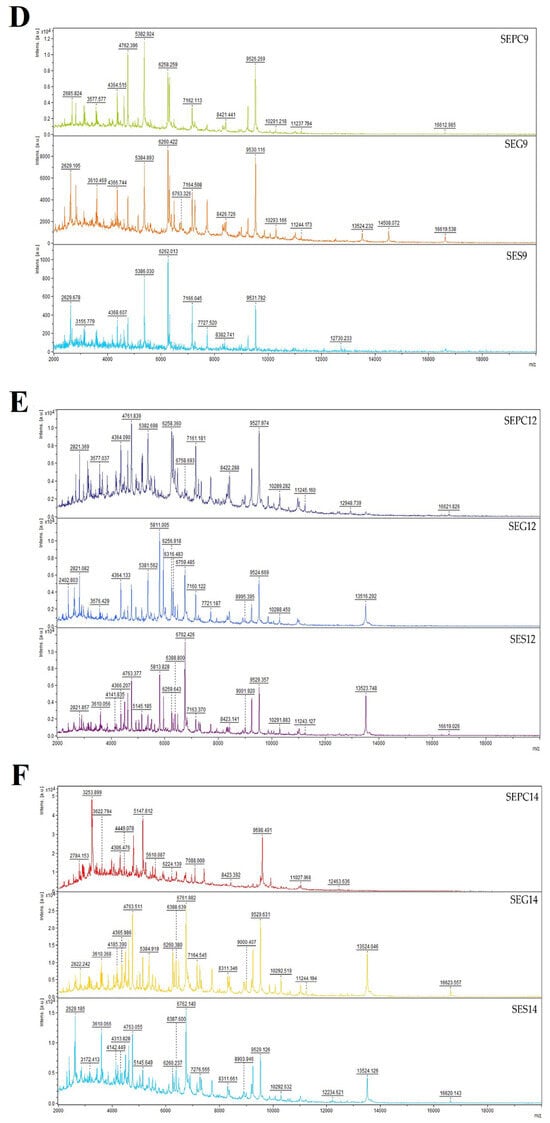 Representative MALDI-TOF mass spectra of S. enterica: (A) 3rd day, (B) 5th day, (C) 7th day, (D) 9th day, (E) 12th day, and (F) 14th day. SE = S. enterica; G = glass; S = stainless steel; PC = planktonic cells.