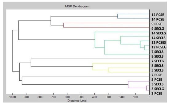 Using MSP distances, a dendrogram was created to depict the similarities in biofilm structure between the control and experimental groups (Figure 3). Remarkably, the shortest MSP distances were observed during the early stage of the experimental biofilm groups on the 3rd day (3 SECLG), aligning with the control group (3 PCSE). With the increased exposure time of the experimental groups to CLEO, their MSP distances also increased. The most significant difference was noted on the 9th day of the experiment, where the MSP distance of the experimental group was maximal, particularly for the experimental group on the glass surface (9 SECLG). Based on these observations, it is inferred that CLEO has an impact on the homeostasis of the S. enterica biofilm, contributing to its inhibition. These findings align with the outcomes of the mass spectra analysis. In the study of Kačániová et al. [], the antibiofilm activity molecular profile of C. aurantium was evaluated. Using dendrograms obtained by MSP spectra to show the grouping patterns of S. maltophilia and B. subtilis, the genetic similarity was investigated in relation to the molecular differences of biofilm development on various days. Early growth variants of S. maltophilia exhibited differentiated branches in both planktonic cells and all experimental groups. In contrast, when comparing the grouping pattern of B. subtilis to the media matrix, a time span preference can be observed, with no discernible variation between variants.