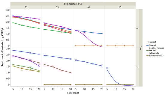 The outcomes of the total bacterial count. Total bacterial count treated at temperatures ranging between 50 and 65 °C for durations of 5 to 20 min. (expressed in log CFU/g) on the first day. Data are the mean (±SD) of 3 samples. Control: Fresh carrot sample was treated at 50–65 °C for 5 to 25 min after being packed in polyethylene bags and kept at 4 °C. Control vacuum: Fresh carrot sample was treated at 50–65 °C for 5 to 25 min after being vacuum-packed in polyethylene bags and kept at 4 °C. EO: vacuum-packed fresh carrot treated with 1% lime EO was kept at 4 °C and treated for 5–25 min at 50–65 °C. Salmonella: vacuum-packed fresh carrot treated with S. enterica was kept at 4 °C and treated for 5–25 min at 50–65 °C. Salmonella + EO: vacuum-packed fresh carrot treated with S. enterica and 1% lime EO was kept at 4 °C and treated for 5–25 min at 50–65 °C.