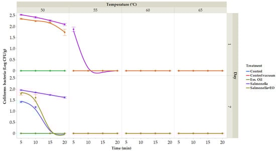 The number of coliform bacteria (CB) on day 1 in the control group, vacuum-packed control group, and CLEO group was not identified (Figure 5). On day 7, in the control samples, CB ranged from 1.19 (50 °C for 10 min) to 1.42 log CFU/g (50 °C for 5 min); the vacuum packaged and in the group with coliform bacteria CLEO was not identi-fied. In the group with the addition of S. enterica on the first day, CB ranged from 1.88 (55 °C for 5 min) to 2.53 log CFU/g (50 °C for 5 min), and on the seventh day, ranged from 1.62 (50 °C 20 min) to 1.96 log CFU/g (50 °C for 5 min). In the group treated with CLEO and with S. enterica, CB ranged from 1.74 (50 °C for 20 min) to 2.35 log CFU/g (50 °C 5 min) on the first day and on the seventh day from 1.61 (50 °C for 10 min) to 1.79 log CFU/g (50 °C 5 min).