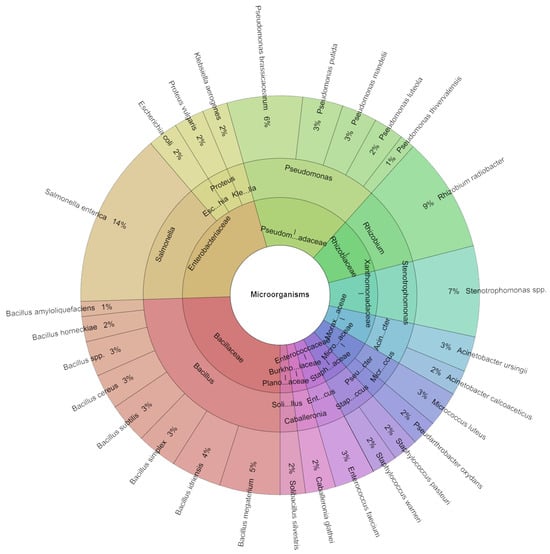 In carrot sous vide samples across all groups on the first day, a total of 245 species were isolated. Among all isolates, 11 families, 15 genera, and 28 species were identified. The predominant species were S. enterica (14%) and R. radiobacter (9%), with Stenotrophomonas spp. (7%) and P. brassicacearum (6%) also being prominently identified across all groups (Figure 6).