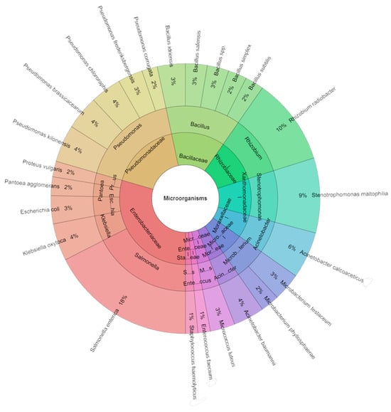 In the carrot sous vide samples across all groups over seven days, a comprehensive isolation effort led to the identification of a total of 268 species. Among these isolates, 10 families, 14 genera, and 24 species were recognized. The predominant species included S. enterica (18%) and R. radiobacter (10%), trailed by S. maltophilia (9%) and A. calcoaceticus (6%) across all groups (Figure 7).