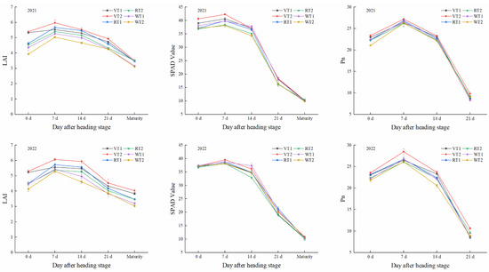 During the grain filling process, the LAI, SPAD, and Pn all first increased and then decreased, and peaked at 7 d after heading (Figure 1). Among different rotation patterns, the maximum values of LAI, SPAD, and Pn were obtained under the V pattern and followed the trend of V > R > W. At 7 d after heading, the LAI, SPAD, and Pn under the V pattern were 3.98–4.86%, 0.99–5.96%, and 0.92–3.95% higher than those under the R pattern, and were 8.38–11.65%, 1.25–6.42%, and 1.34–3.78% higher than those under the W pattern, respectively. Among the different planting methods, the LAI, SPAD, and Pn under VT2 significantly increased by 4.34–8.98%, 3.29–4.19%, and 3.03–7.40%, respectively, when compared to those under VT1. Additionally, the LAI, SPAD, and Pn under RT1 and WT1 significantly increased by 5.69–5.80%, 3.29–3.91%, and 2.41–2.48%, and by 4.77–8.04%, 1.65–4.46%, and 1.41–2.33%, respectively, when compared to those under RT2 and WT2. In conclusion, rice plants demonstrated superior photosynthetic characteristics under VT2, RT1, and WT1, which was conducive to photosynthesis and matter accumulation.