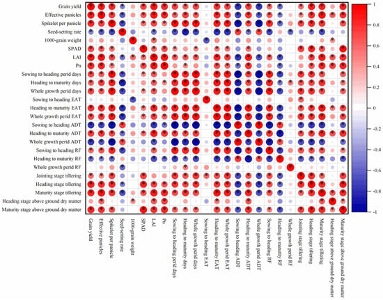 Climate resources such as temperature, light, and rain fall are the main factors affecting rice yield [31]. Appropriate cultivation methods can effectively improve the production efficiency of temperature and light, ultimately leading to increased yield [32,33,34]. In this study, significant differences in the EAT, ADT, RF, growth period process, and yield of rice at each growth stage were found under different crop rotation patterns and planting methods. Correlation analysis results showed that GY was significantly positively correlated with the whole growing period at each growth stage, EAT after the heading stage, whole growing period EAT, ADT after the heading stage, RF during the sowing to heading stage, tillering at each growth stage, above-ground dry matter accumulation at the maturity stage, and each photosynthetic index. Conversely, GY exhibited significant negative correlations with ADT during the sowing to heading stage, whole growth period ADT, and rain fall during the heading to maturity stage.