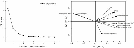 GY consists of many evaluation indexes, and the most important factor of these that affects the formation of GY cannot be determined only from correlation analysis results. PCA is one of the most widespread statistical methods that convert multiple indexes into multiple comprehensive indexes and determine their relative importance, and ensure that the amount of information after a dimensionality reduction is maintained at a sufficiently high level [35,36]. SEM is a method for establishing, estimating, and testing causal relationship models, and has been applied to reveal and test hypothetical models, as well as to discover the interactions between variables [37]. PCA results showed that PC1 mainly included EAT, spikelet per panicle, and effective panicles, while PC2 mainly included Pn, RF, and SPAD, with RF exerting a negative impact. The top three score treatments in PC1 were VT1, VT2, and RT1, indicating superior performance in EAT, spikelet per panicle, and effective panicles. In PC2, the top three score treatments were VT2, WT2, and WT1, indicating enhanced performance in Pn, RF, and SPAD. Overall, the top three comprehensive score treatments were VT2, VT1, and RT1, with VT2 exhibiting the highest yield. SEM results showed that EAT and ADT played dominant roles in rice yield with total effects of 0.520 and −0.446, respectively. EAT positively influenced rice yield, while ADT exhibited a negative effect. Path analysis showed that the direct effects of the EAT and ADT on rice yield were limited, and their primary influence occurred indirectly by affecting EP, SS, and growth period, with indirect effects of 0.792 and −0.545, respectively.