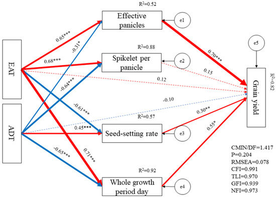 Structural equation model of yield, EAT, ADT, and yield components. EAT and ADT refer to effective accumulated temperature and average daily temperature, respectively. The arrows in the figure point to the causal relationship, the red solid line indicates a positive significant correlation, the blue solid line indicates a negative significant correlation, the red dotted line indicates a positive but not significant correlation, and the blue dotted line e indicates a negative but not significant correlation. The number refers to the effect coefficient. *, **, and *** refer to a significant correlation at a 0.05 level, 0.01 level, and 0.001 level, respectively. The R2 indicates the total explanatory rate of all variables pointing to the dependent variable. The e, CMIN/DF, P, RMSEA, CFI, TLI, GFI, and NFI represent the unobserved variable, ratio of chi-squared value to the degree of freedom, test p-value, root-mean-square error of approximation, comparative fit index, Tucker–Lewis index, goodness of fit index, and normed fit index, respectively.