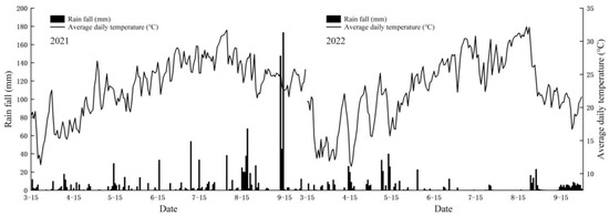 The national meteorological monitoring station (CAWS600, China Huayun Meteorological Technology Group Co., Ltd., Beijing, China) was used to record the average daily temperature and rain fall in the rice growing season and to accurately record the main growth period of rice. The effective accumulated temperature of each growth stage was calculated using the following formula, Ke = , where T1 is the average daily temperature on day i and T0 is the developmental threshold temperature of the plant, which is 10 °C [39,40]. The climate data of the experimental site are shown in Figure 6.
