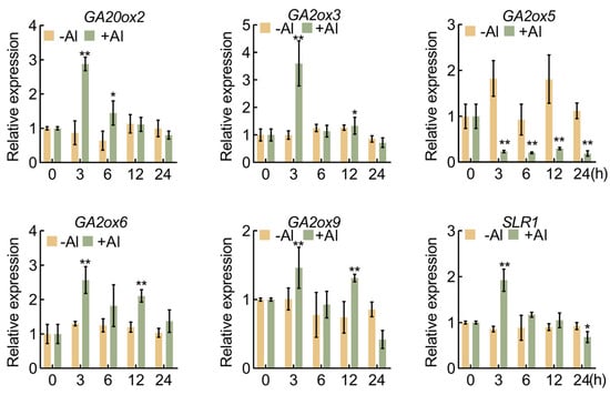 Expression of genes involved in gibberellin biosynthesis and signal transduction under aluminum stress. Quantification of GA biosynthesis genes GAs and GA signaling gene SLR1 upon Al treatment. Error bars indicate SD (n = 3). Asterisks indicate significant differences compared with the corresponding controls (* p < 0.05; ** p < 0.01). The experiments were independently repeated at least three times.