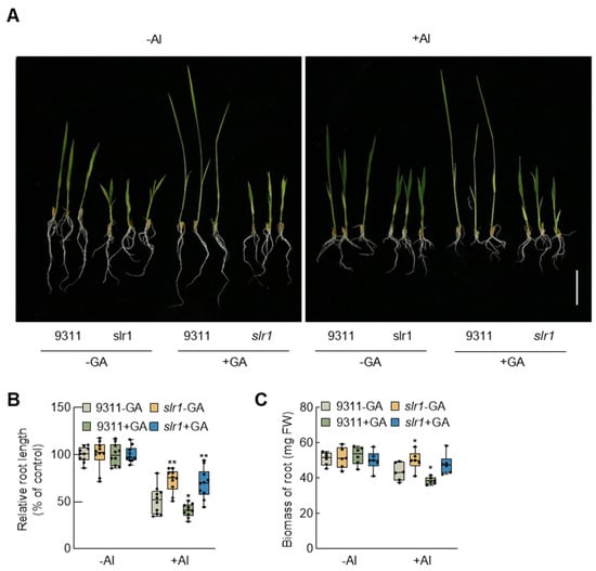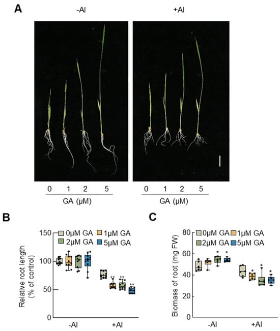 Influence of gibberellin on the phenotype of rice seedlings subjected to aluminum stress. (A) Performance of 5-day-old rice seedlings treated with gibberellin at different concentrations for 7 days in the presence of Al stress. Scale bar = 5 cm. (B) Relative root length of rice seedlings treated with water or different concentrations of gibberellin under Al stress. Error bars indicate SD (n = 10). (C) Biomass of roots of rice seedlings treated with water or different concentrations of gibberellin under Al stress conditions. Error bars indicate SD (n = 6). Asterisks indicate significant differences compared with the corresponding controls (* p < 0.05; ** p < 0.01). The experiments were independently repeated at least three times.