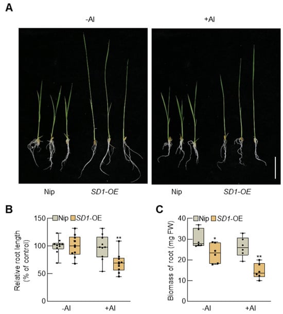 Overexpression of the SD1 negatively regulates rice resistance to aluminum stress. (A) Performance of 5-day-old wild-type and SD1-OE seedlings under Al stress conditions for 7 days. Scale bar = 5 cm. (B) Relative root length of the wild-type and SD1-OE seedlings after Al treatment. Error bars indicate SD (n = 10). (C) Biomass of roots of the wild-type and SD1-OE seedlings under Al stress conditions. Error bars indicate SD (n = 6). Asterisks indicate significant differences compared with the corresponding controls (* p < 0.05; ** p < 0.01). The experiments were independently repeated at least three times.