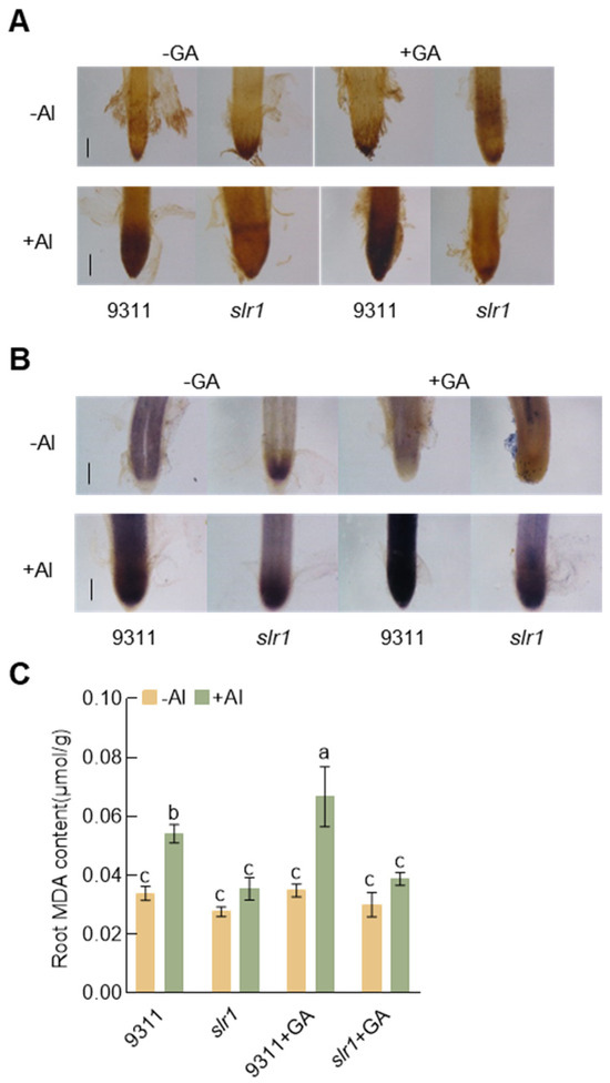 Amid aluminum stress, the presence of Al3+ induces the significant accumulation of ROS in rice root tips, resulting in lipid peroxidation and ultimately affecting root growth. [42]. To assess ROS accumulation, rice root tips were stained using nitroblue tetrazolium (NBT) and 3,3′-diaminobenzidine (DAB). Our observations revealed that exogenous GA led to increased ROS accumulation in wild-type rice root tips, whereas slr1 exhibited reduced ROS accumulation (Figure 5A,B). Elevated ROS levels induce peroxidation of plant membrane lipids, generating malondialdehyde (MDA) as a byproduct. MDA levels serve as an indicator of cell oxidation levels. Subsequent testing of MDA content in rice roots indicated that GA application increased MDA accumulation in aluminum-stressed wild-type rice, while slr1 showed no significant difference (Figure 5C). These results suggest that blocking GA signaling can mitigate the toxic effects of aluminum stress on rice roots by reducing ROS accumulation.