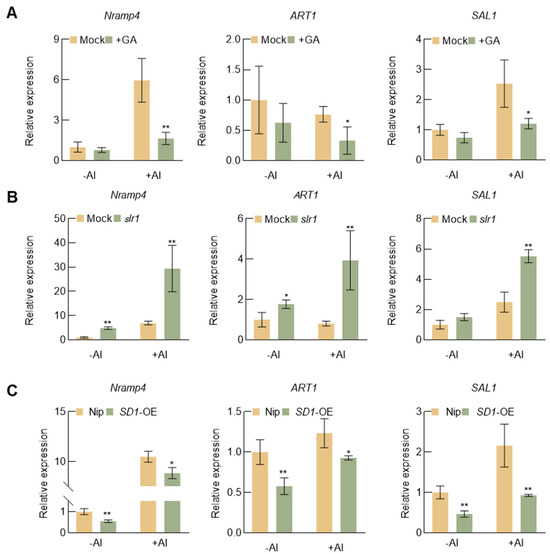 Effect of gibberellin on the expression of genes related to aluminum tolerance. (A) Influence of GA application on the expression of OsNramp4, ART1, and SAL1 in wild-type roots under Al stress conditions. Error bars indicate SD (n = 3). (B) Transcript levels of OsNramp4, ART1, and SAL1 in wild-type and slr1 roots under Al stress conditions. Error bars indicate SD (n = 3). (C) Transcript levels of OsNramp4, ART1, and SAL1 in wild-type and SD1-OE roots under Al stress conditions. Error bars indicate SD (n = 3). Asterisks indicate significant differences compared with the corresponding controls (* p < 0.05; ** p < 0.01). All experiments were repeated independently three times.