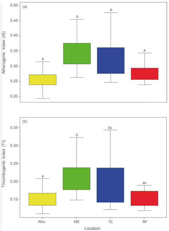 RF presented the lowest n-6/n-3 ratio, whilst the highest ratio was recorded in ME (Figure 1). Ratio values in northern locations—RAv (0.55) and ME (0.58)—differed from those observed in southern locations—TE (0.34) and RF (0.35).