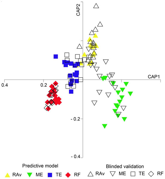The CAP performed achieved a correct allocation of 93% of samples (Figure 3, Table S3). Plants collected from RF exhibited the highest percentage of correct classifications (100%), followed by samples from TE (96.7%), RAv (90.0%), and ME (86.7%). CAP results showed an overall model success rate of 95% (Table S4). When comparing the modelled predictions with the allocation of blind samples, the error for Rav and RF was 0%, i.e., all Rav and RF samples were correctly allocated to their places of origin. The errors associated with ME and TE were 40% and 27%, respectively.