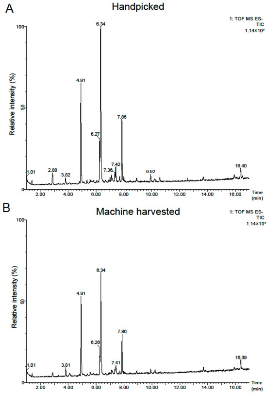 Tea products (Camellia sinensis var. sinensis cv. ‘Tieguanyin’) made from handpicked and machine-harvested leaves were obtained during the autumn of 2022. All the tea plants were from the same production site. The metabolomic profiles of the final tea products were assessed in order to explore the impact of harvesting method on the metabolic profiles of these teas. Figure 1 showcases a chromatogram illustrating the total ion current (TIC) of representative tea samples, analyzed using a UPLC-QToF-MS in ESI (electrospray ionization) negative mode. A total of 1967 distinct features were identified with 182 metabolites successfully annotated. The detailed annotation information of the metabolites is presented in Table S1. The majority (53.8%) of these metabolites belong to the flavonoid category, encompassing flavonoid glycosides, flavans, bioflavonoids, and polyflavonoids, followed by prenol lipids (13.7%) which are triterpene saponins (Figure S1).
