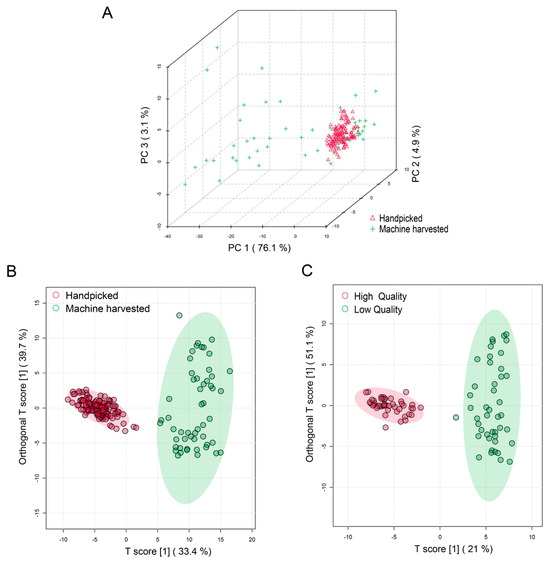 (A) PCA score plot of Tieguanyin tea products made from handpicked and machine-harvested leaves; (B) OPLS-DA score plot of Tieguanyin tea products made from handpicked and machine-harvested leaves; (C) OPLS-DA score plot of high- and low-grade Tieguanyin tea products.