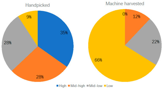 To link these metabolite changes to sensory quality, we conducted a sensory evaluation on all samples. The metabolomic differences between handpicked and machine-harvested tea were reflected in the sensory grading. Handpicked groups had a more balanced distribution of all sensory grades with 9% of the finished products being graded as low level, while 66% of the machine-harvested leaves ended as low-grade tea (Figure 3).