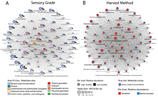 (A) Correlation network (|r| > 0.7 and p < 0.05) of sensory-related metabolites for high- and low-grade Tieguanyin products based on VIP > 1 metabolites identified in OPLS-DA analysis. (B) Correlation network (|r| > 0.7 and p < 0.05) of metabolites between handpicked and machine-harvested tea using OPLS-DA. Compound text font is proportional to its VIP value.