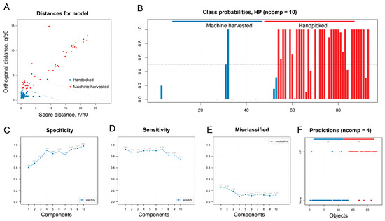 DD-SIMCA models for differentiating oolong tea products made from handpicked or machine-harvested leaves. (A) DD-SIMCA score plot; (B) class probabilities; (C) specificity; (D) sensitivity; (E) misclassified; (F) productions.