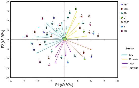 Multiple Component Analysis (MCA) highlighting the relationship between apple storage conditions and the observed damage (low = 110%; moderate =10−20%; high = 20−30%; very high = 30−40%). The arrow direction indicates the correlation between each variable and the correspondence axes (F1 and F2). The arrow length shows the relative contribution of the variables to the axes and storage conditions. The numbers above circles represent the attributes of each variable studied in Table 3. Abbreviations: PHT, postharvest treatment; CCD, cold chamber disinfection; BD, box disinfection; BT, box type; FSBS, fruit sorting before storage; ST, storage temperature; SD, storage duration.
