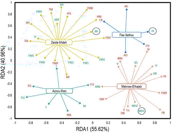 The tendencies of the surveyed Moroccan apple storage warehouses in terms of observed damage were explored through redundancy analysis (RDA) (Figure 2). The fractions of variance for the associated axes (RDA1 and RDA2) were 55.62% and 40.96%, respectively. Large conservation stations with less damage (1–20%) were observed in the Zaida−Midelt and Azrou−Ifran regions. Conversely, the regions of Fez−Sefrou and Meknes−Elhajeb have conservation warehouses with a high damage percentage (40%). Interestingly, three conservation stations (JA, MH1, and BK) recorded the lowest damage percentages (1–10%), as they are controlled atmosphere storage warehouses.
