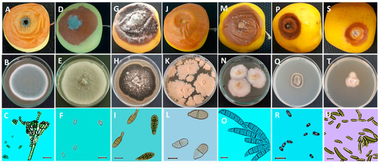 Morphological characteristics of the main diseases affecting apples during storage. (A,D,G,J,M,P,S): appearance of apple (Golden Delicious) rot after inoculation with spore solution (104 spores/mL) and incubation for 14 days at 25 °C. (B,E,H,K,N,Q,T): pathogen colonies on Potato Dextrose Agar (PDA) medium after incubation for 7 to 14 days at 25 °C. (C,F,I,L,O,R,U): microscopic observation (×40) of conidia and mycelium of pathogens. A, B, and C: blue mold caused by Penicillium expansum. (D,E,F): gray mold caused by Botrytis cinerea. (G,H,I): Alternaria rot caused by Alternaria alternata. (J,K,L): bitter rot caused by Trichothecium roseum. (M,N,O): Fusarium rot caused by Fusarium avenaceum. (P,Q,R): side rot caused by Cadophora malorum. (S,T,U): gloeosporiosis caused by Neofabraea vagabunda. Scale bar = 10 μm.