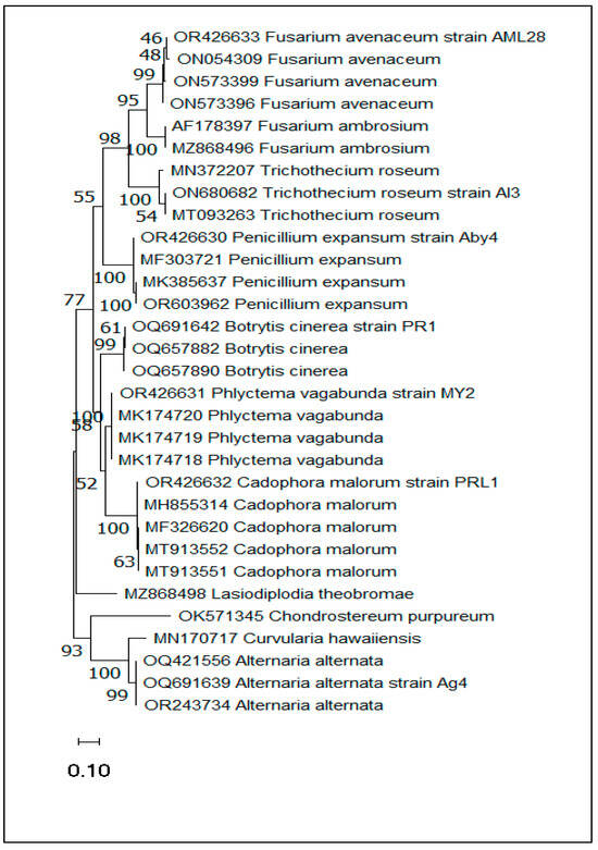 Based on morphological characteristics, the results indicated that postharvest fungal diseases affecting apples are caused by seven pathogens: Penicillium expansum (Aby4), Botrytis cinerea (PR1), Alternaria alternata (Ag4), Trichothecium roseum (AI3), Fusarium avenaceum (AML28), Cadophora malorum (PRL1), and Neofabraea vagabunda (MY2).