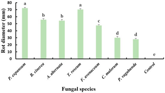 Statistical analysis of apple lesion diameters, inoculated with 50 µL of spore suspension (104 spores/mL) and incubated in plastic boxes at 25 °C for 14 days in growth chambers, revealed a significant difference (p < 0.05) in the pathogenicity of the seven fungal isolates. The most virulent isolates were P. expansum and T. roseum, with lesion diameters of 72.39 ± 0.83 mm and 70.29 ± 1.18 mm, respectively. Next were B. cinerea and A. alternata, which caused substantial lesions with diameters of 55.74 ± 1.58 mm and 54.45 ± 1.83 mm, respectively. F. avenaceum was moderately virulent, resulting in a rot with a diameter of 47.56 ± 1.31 mm. On the other hand, N. vagabunda and C. malorum are the least aggressive isolates, inducing smaller lesions with diameters of approximately 28.09 ± 1.34 mm and 30.18 ± 1.86 mm, respectively (Figure 5).