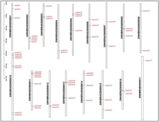 According to the study by Hongyu Chen et al., A. argyi can be assembled into 17 pseudochromosomes on the chromosome scale [30]. A total of 57 AaIAA genes in A. argyi were distributed on 17 chromosomes (Chr), with AaIAA58, AaIAA59, AaIAA60, and AaIAA61 distributed in the scaffolds of GWHBRAE00001633, GWHBRAE00001586, GWHBRAE00001446, and GWHBRAE00002123, respectively (Figure 1). The distribution of AaIAAs genes varies: there was just a single AaIAA57 gene on Chr17; Chr10 had the largest number with eight total genes; Chr11 had seven genes; and the remaining 15 chromosomes were distributed with two to four genes. In addition, there are tandem duplication phenomena in the distribution of AaIAA genes, including AaIAA5 and AaIAA6 genes on Chr2, AaIAA22 and AaIAA23 genes on Chr8, and AaIAA55 and AaIAA56 genes on Chr16 (Figure 1).