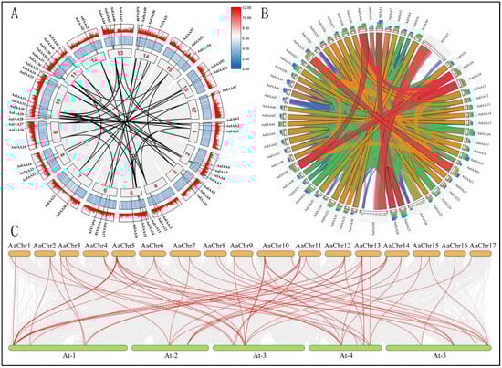 Collinear prediction and sequence similarity analysis of the Aux/IAA genes in A. argyi. (A): Mapping of collinear prediction of the AaIAA family genes in A. argyi. Black lines show AaIAA paralogs, red maths indicates chromosome numbers. (B): Visualising sequence similarity of the AaIAA genes in A. argyi. Different colored ribbons represent different levels of similarity, blue ≤ 50%, green ≤ 75%, orange ≤ 99%, red > 99%. (C): Collinear prediction of the Aux/IAA family genes between A. thaliana and A. argyi. Red lines show the collinear events.