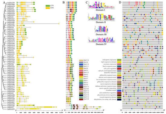 Gene structure, conserved motif, conserved domains, and promoter cis-element analysis of the Aux/IAA family genes in A. argyi. (A) Exon–intron organization of A. argyi Aux/IAA genes. (B) Conserved motif analysis of A. argyi Aux/IAA proteins. (C) The amino acid sequence of four typical conserved domains. (D) Cis-element analysis in the promoters of A. argyi Aux/IAA genes.