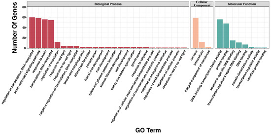 Gene Ontology (GO) annotation was performed for all 61 Aux/IAA genes to examine the biological influences they exert (Table S4). In biological processes, a maximum of 60 genes responded to the regulation of transcription, DNA-templated; followed by the auxin-activated signaling pathway (59 genes); response to auxin (56 genes); and transcription, DNA-templated (55 genes). In terms of cellular components, 59, 12, and 2 AaIAA genes were classified into the nucleus, intracellular, and integral components of the membrane, respectively. In addition, at the molecular level, 56 of 61 AaIAA unigenes were recognized as having DNA-binding transcription factor activity, while 48, 15, 11, and 7 AaIAA genes responded to protein binding, sequence-specific DNA binding, transcription regulatory region DNA binding, and DNA binding, respectively (Figure 4).