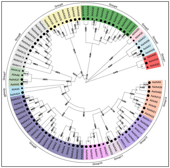 Phylogenetic investigation of Aux/IAA proteins in A. argyi and A. thaliana. The phylogenetic tree was developed using MEGA software (Version: 6.06) and the neighbor-joining method with 1000 bootstraps. Each Aux/IAA group (1 to 13) is indicated by a specific color. AaIAAs in A. argyi are indicated by a solid circle dot, and AtIAAs in Arabidopsis are indicated by a star.