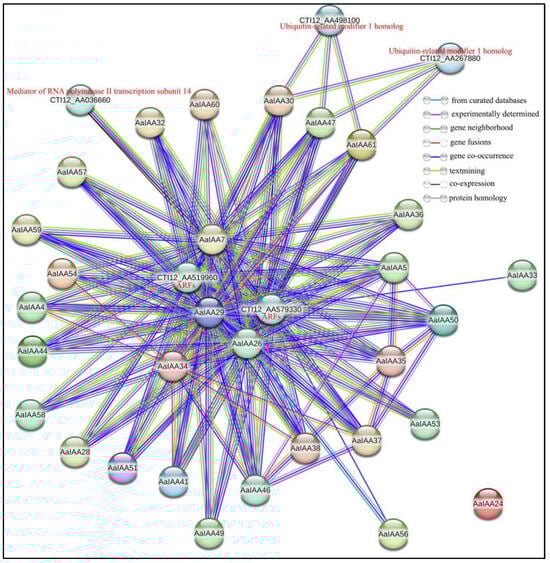 Prediction analysis of Aux/IAA protein interaction in A. argyi. Different line colors indicate the type of interaction evidence.