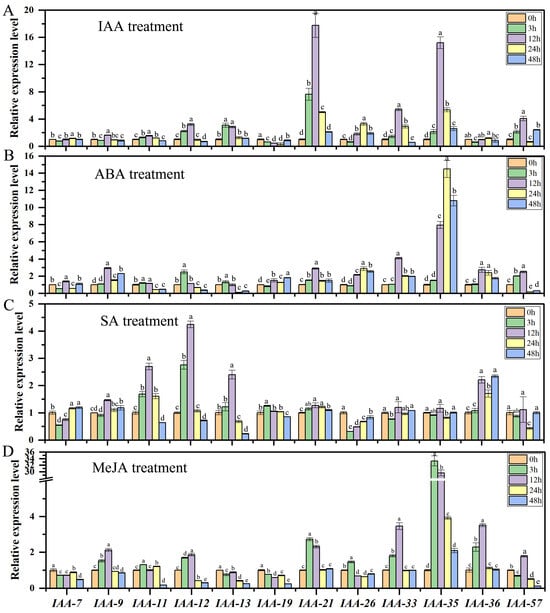 Expression profiles of AaIAA genes under various hormonal treatments. (A) IAA treatment. (B) ABA treatment. (C) SA treatment. (D) MeJA treatment. Error bars represent standard error of the mean; data shown are means ± SE. Letters “a,b,c…” indicate significant differences at p < 0.05.